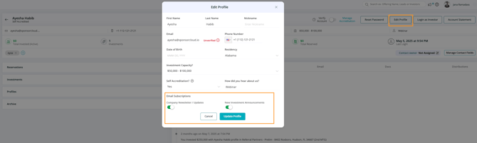 When a contact is added to the platform, their communication preferences can be configured to allow receipt of marketing emails. In alignment with our communication policy, all investors will have the opportunity to opt out of marketing communications or announcements about new investment opportunities upon receiving the first email.