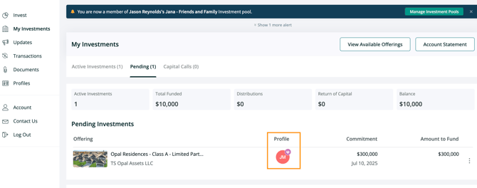 Once the investment is made via an Investment Pool, a small Pool icon will appear next to the investor's name, indicating they’ve invested through a Pool.