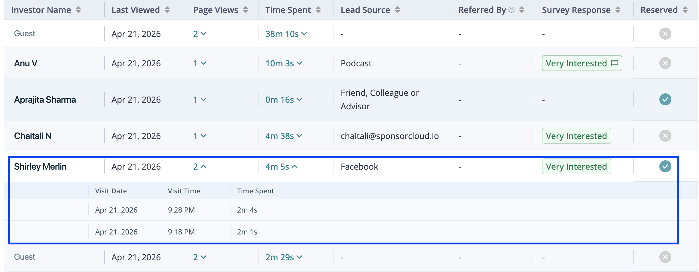 It also shows exactly which investors viewed the page, along with key engagement metrics, and Include separate columns indicating whether the investor has reserved and invested in the deal.