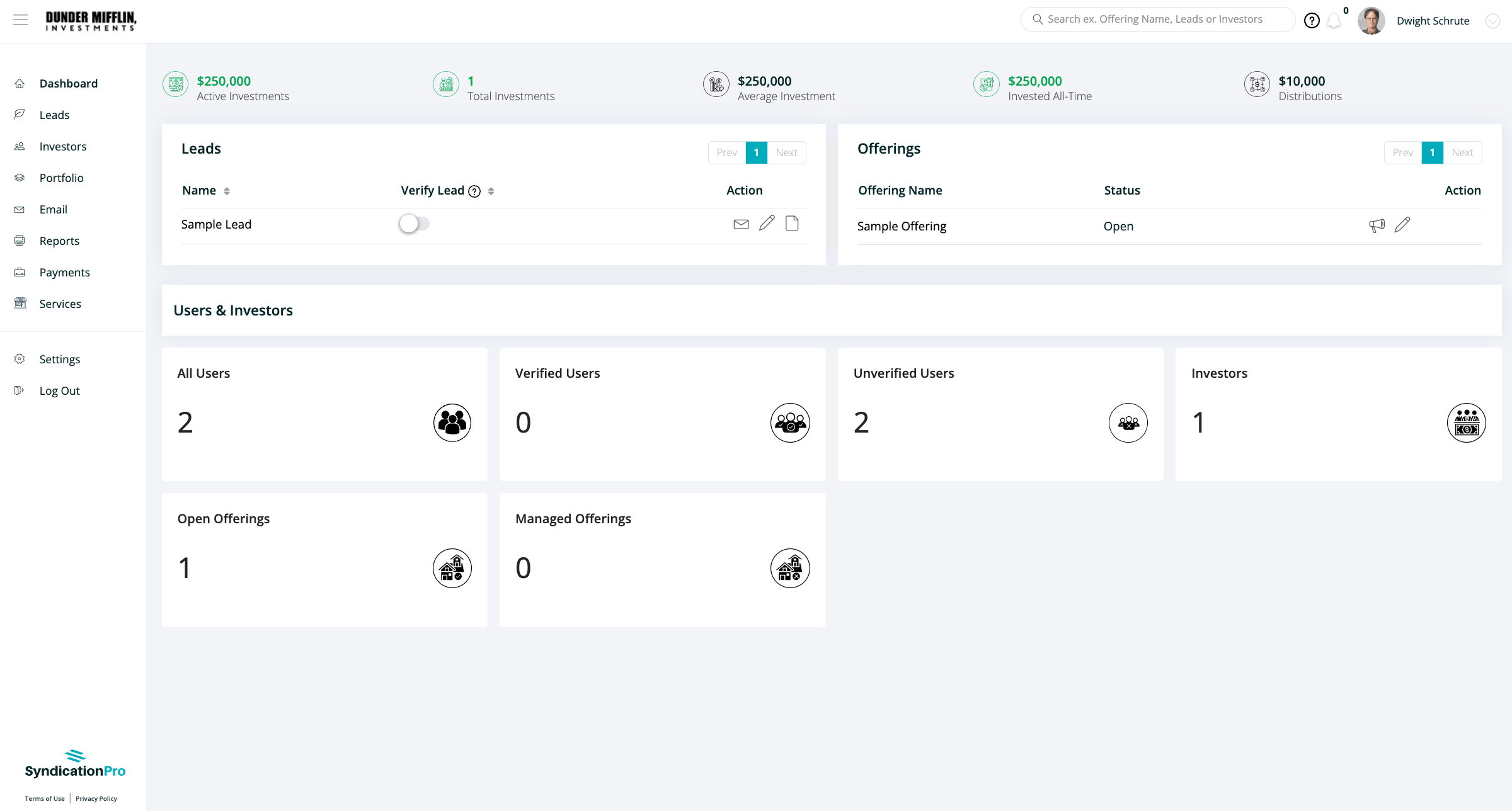 1. Confirm that the cosponsor investment is appearing under the offering(s) as expected. You'll now see that each investment is duplicated because one investment is stored from the lead sponsor account and the other is connected to the cosponsor account. The cosponsor investment will be tagged with the cosposnor's company name.